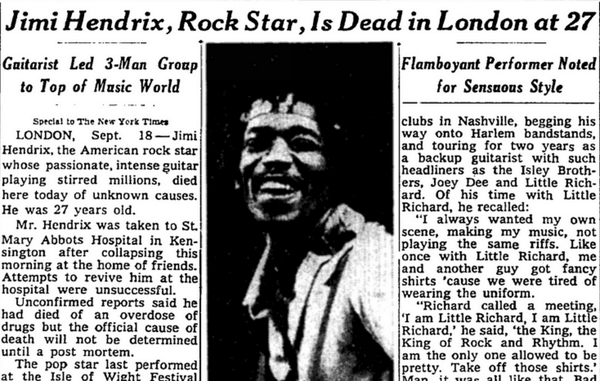 RT @NYTArchives: “Knowing me, I’ll…get busted at my own funeral” – Jimi Hendrix who died this day in 1970. nyti.ms/1uaO1gf http://t.…